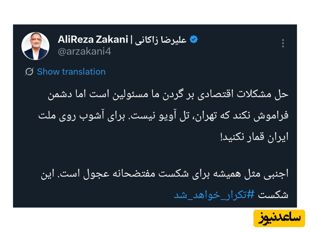 «حل مشکلات اقتصادی بر گردن ما مسئولین است اما دشمن فراموش نکند که تهران، تل آویو نیست. برای آشوب روی ملت ایران قمار نکنید!اجنبی مثل همیشه برای شکست مفتضحانه عجول است. این شکست #تکرار_خواهد_شد»