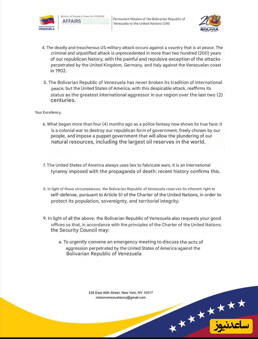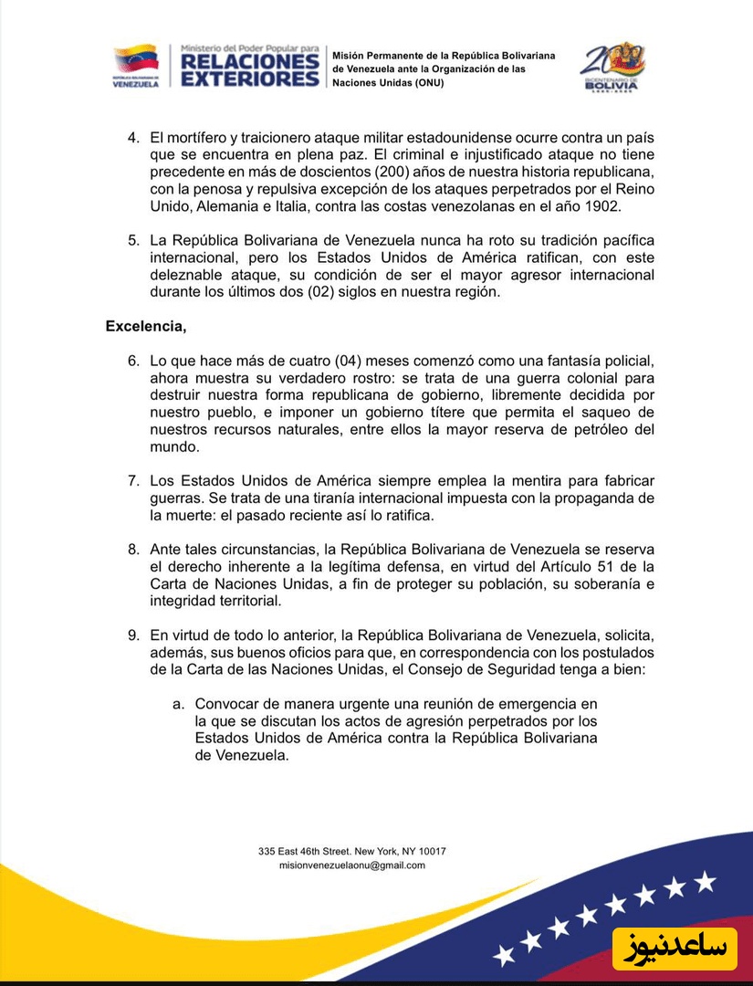به گزارش سرویس سیاسی ساعدنیوز، وزیر امور خارجه ونزوئلا ایوان خیل پینتو در پیامی، ضمن اعلام درخواست برای نشست فوری شورای امنیت سازمان ملل در پی تجاوز نظامی آمریکا به خاک کشورش، تاکید کرد که «هیچ حملهی بزدلانهای بر قدرت این مردم غلبه نخواهد کرد؛ آنها پیروز بیرون خواهند آمد».