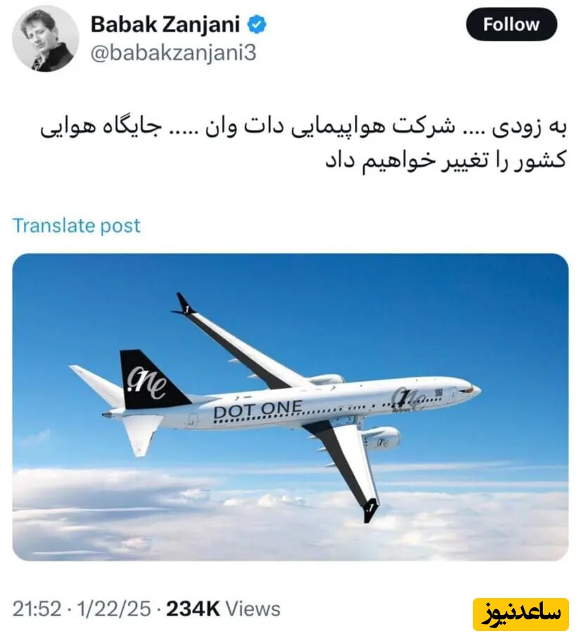 ساعدنیوز: بابک زنجانی از راه اندازی ایرلاین بزرگ و مدرن جدید در ایران با نام ایرلاین دات وان خبر داد