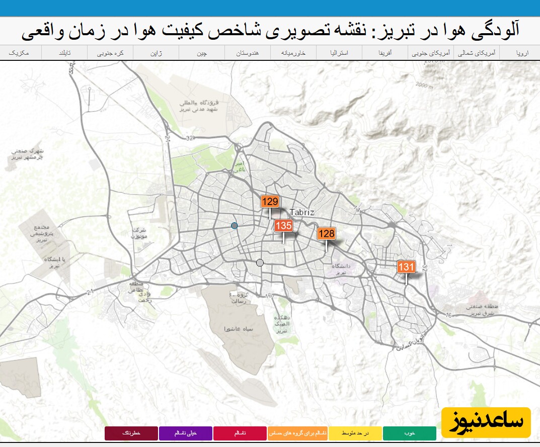 شاخص کیفی هوا از صفر تا 50 هوای پاک (سبز)، 51 تا 100 هوای قابل قبول (زرد)، 101 تا 150 ناسالم برای گروههای حساس (نارنجی)، 151 تا 200 ناسالم برای عموم (قرمز)، 201 تا 300 بسیار ناسالم (بنفش) و 301 تا 500 بسیار خطرناک (قهوهای) است.