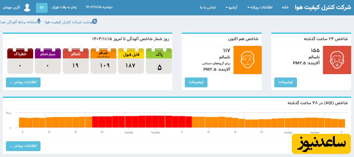 از ابتدای سال جاری تا امروز در تهران پنج روز هوای پاک، 187 روز هوای قابل قبول، 109، روز هوای ناسالم برای گروههای حساس و 19 روز هوای ناسالم در شاخص آلودگی هوا به ثبت رسیده است.