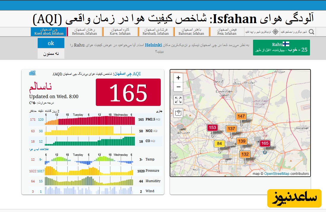 همچنین طی 24 ساعت گذشته شاخص کیفیت هوا بر روی عدد 111 قرار داشت و کیفیت هوا ناسالم بود.