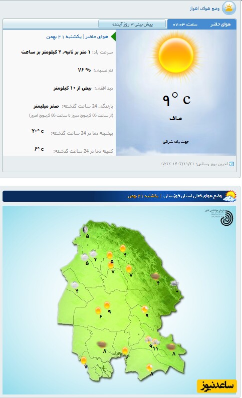 ساعدنیوز: کیفیت هوا و وضعیت آب و هوای شهرهای تهران، تبریز، اصفهان، مشهد و اهواز امروز یکشنبه 21 بهمن بر اساس آمار ایستگاههای سنجش کیفیت هوا در مناطق مختلف اعلام شد.