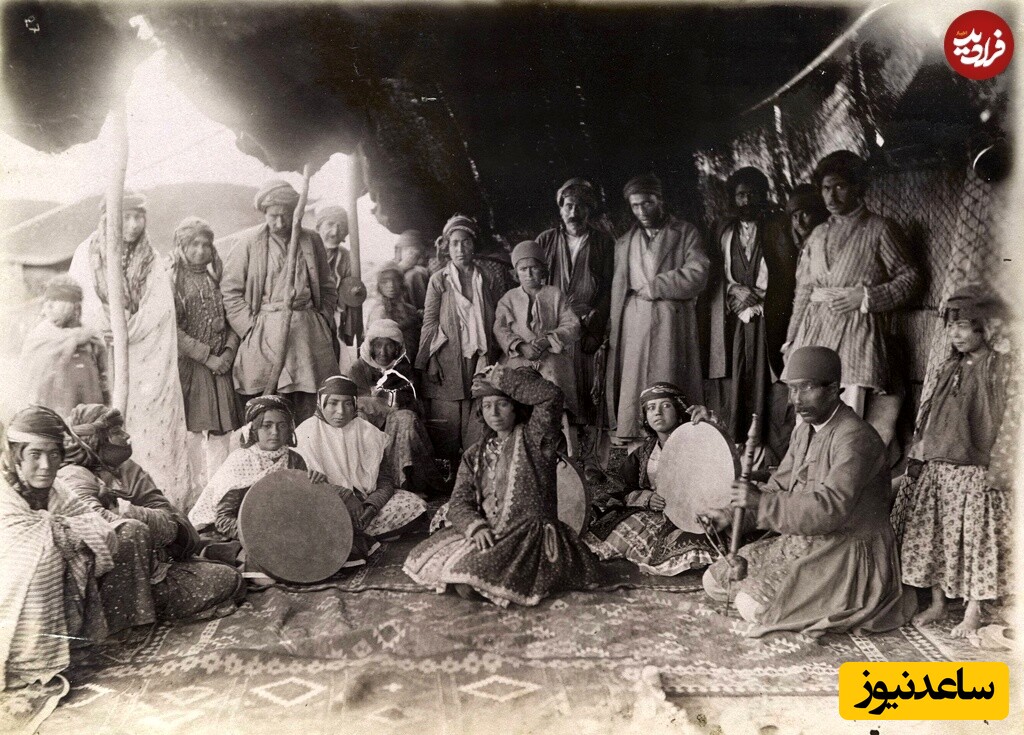 گروهی از نوازندگان در یک چادر عشایری؛ شخصی که در میانۀ تصویر نشسته نیز ظاهرا در حال اجرای حرکات موزون است.