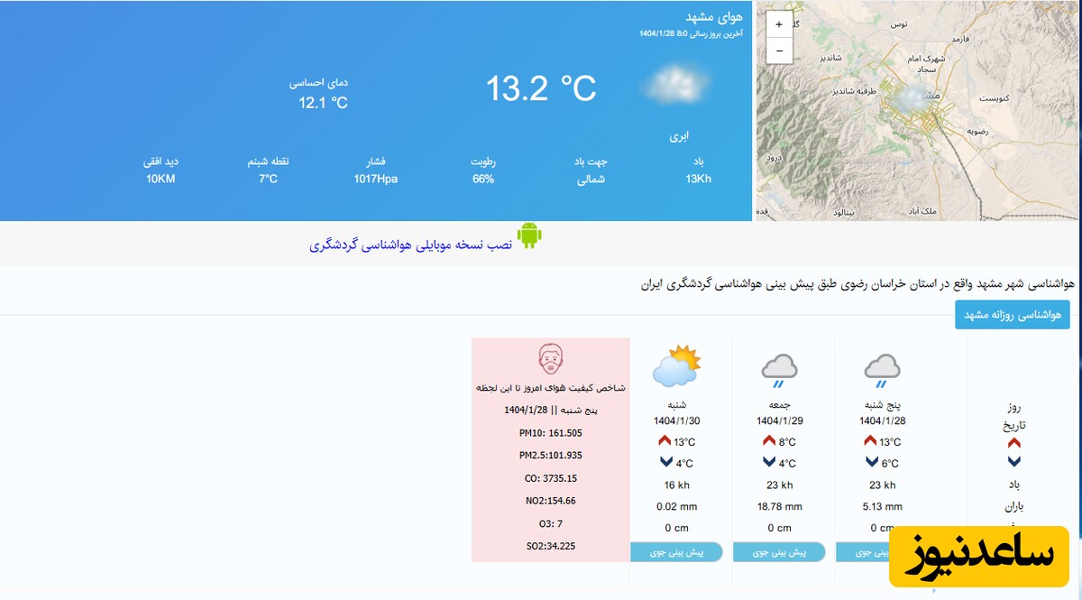ساعدنیوز: وضعیت آب و هوای شهرهای تهران، تبریز، اصفهان، مشهد، اهواز، قزوین، شیراز، بوشهر، رشت، ارومیه، کرمانشاه و یزد امروز پنج‌شنبه 28 فروردین بر اساس آمار ایستگاه‌های سنجش کیفیت هوا در مناطق مختلف اعلام شد.