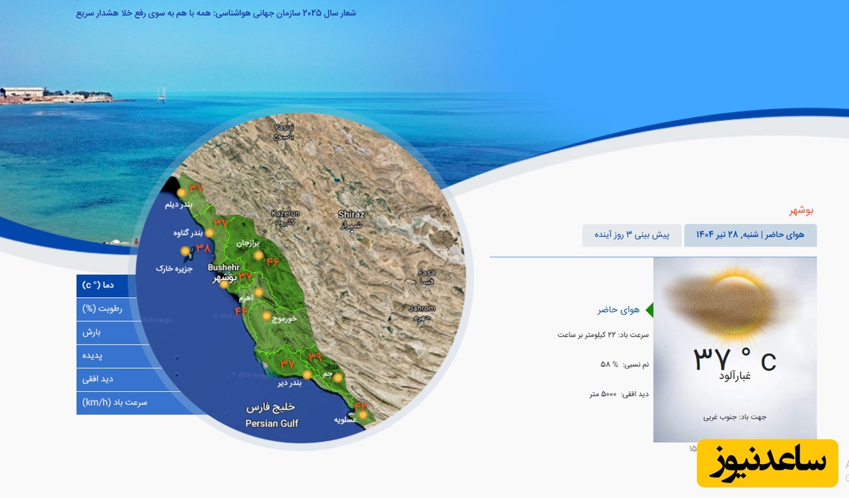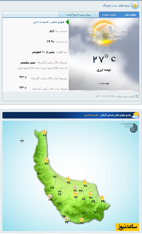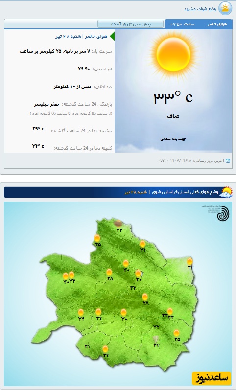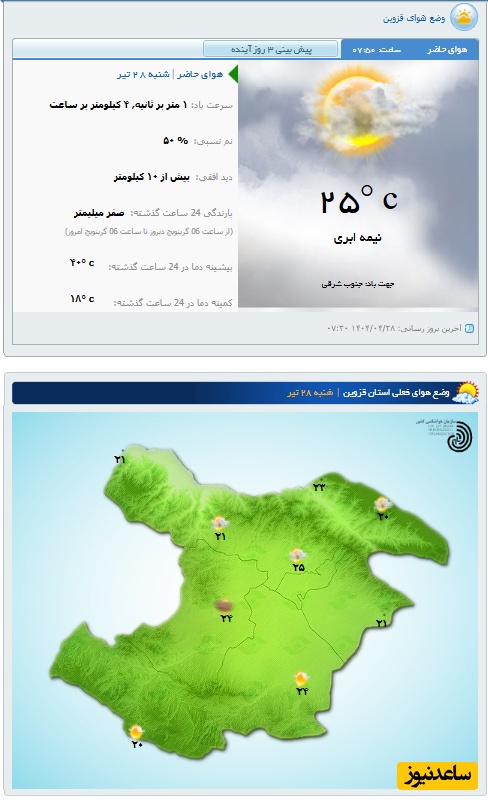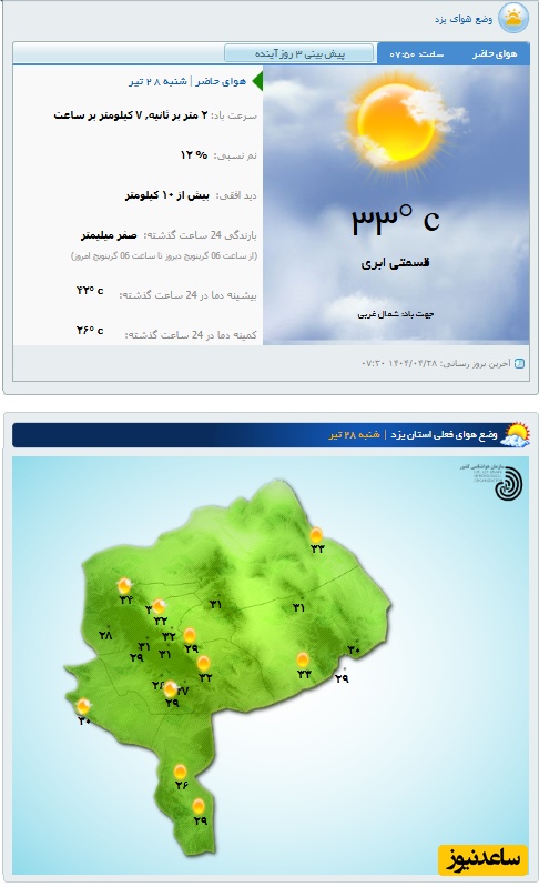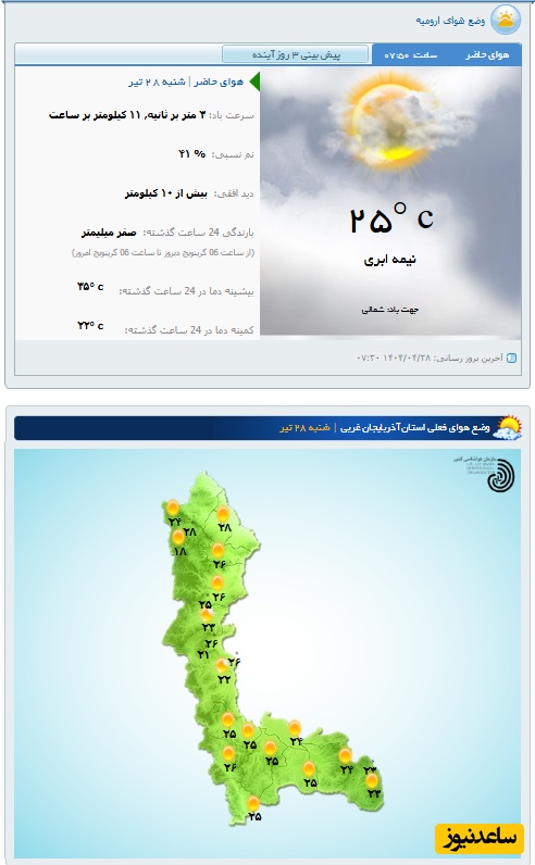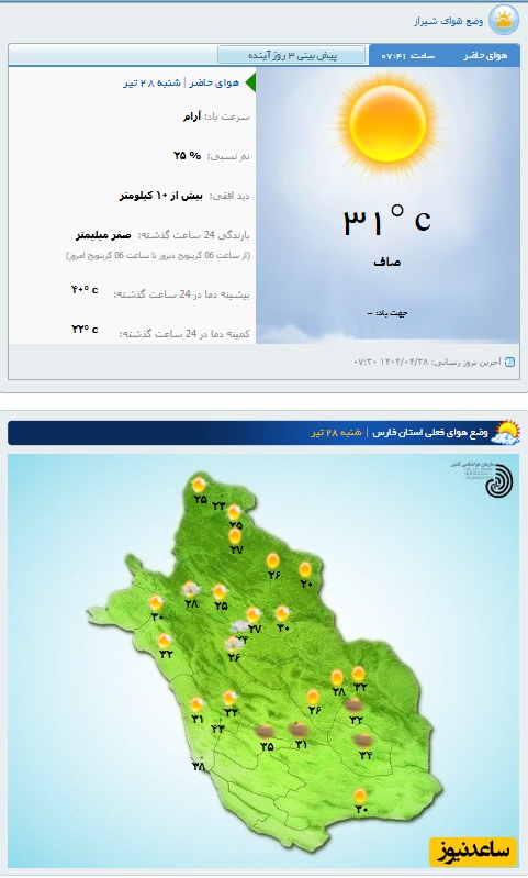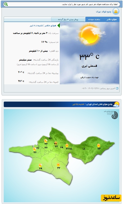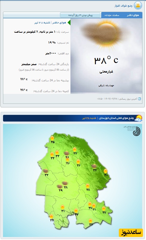 وضعیت آب و هوای امروز شنبه 28 تیر تهران، تبریز، اصفهان، مشهد، اهواز، قزوین، شیراز، بوشهر، رشت، ارومیه، کرمانشاه و یزد