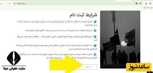 نحوه ثبت نام در سامانه سماح samah.haj.ir برای دریافت ارز اربیعن و ثبت نام ارز اربعین پست بانک، بدین صورت است که متقاضی باید، آدرس سامانه را در مرورگر خود، جستجو نماید و از قسمت پایین صفحه، در بخش شرایط ثبت نام، برروی گزینه "ثبت نام"، کلیک کند.