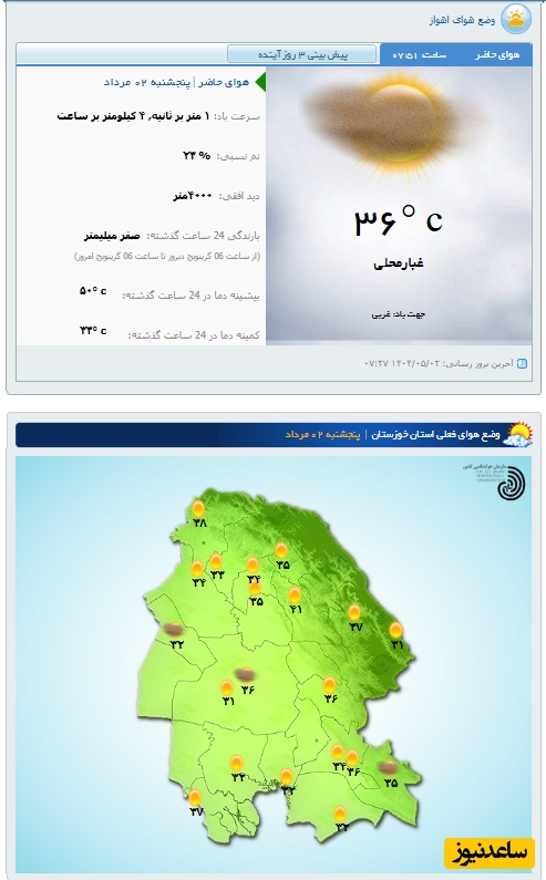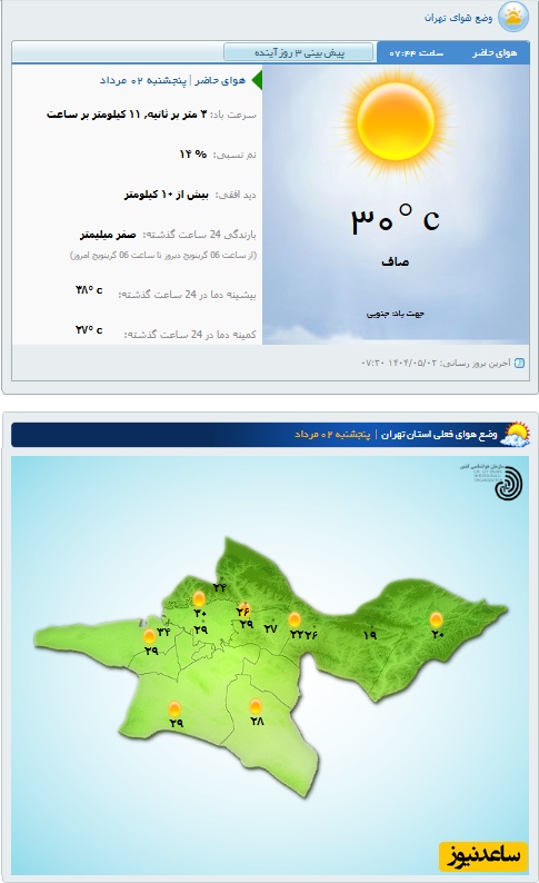 وضعیت آب و هوای امروز پنج‌شنبه 2 مرداد تهران، تبریز، اصفهان، مشهد، اهواز، قزوین، شیراز، بوشهر، رشت، ارومیه، کرمانشاه و یزد