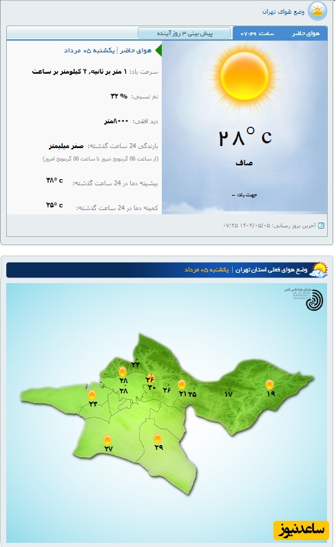 وضعیت آب و هوای امروز یکشنبه 5 مرداد تهران، تبریز، اصفهان، مشهد، اهواز، قزوین، شیراز، بوشهر، رشت، ارومیه، کرمانشاه و یزد