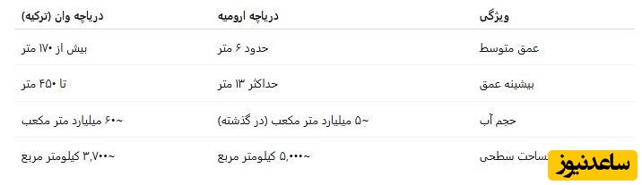در واقع، دریاچه وان اگرچه از نظر سطح، کمی کوچکتر از ارومیه است، اما با توجه به عمق بسیار زیاد خود، 12 برابر بیشتر از ارومیه آب در خود نگه میدارد، این تفاوت عمق باعث میشود تبخیر تأثیر کمتری بر حجم کل آب بگذارد.