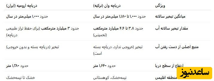 این بدان معناست که با وجود تبخیر مشابه، توان ذخیرهسازی دریاچه وان بهدلیل عمق زیاد و حجم بالاتر، بهمراتب بیشتر از ارومیه است اما همانطور که در جدول پیداست، با وجود تبخیر نسبتاً برابر، تأثیر تبخیر در وان کمتر است، چراکه حجم آب بسیار بالاتری در دریاچه وجود دارد و کاهش آب سطحی نسبت به ذخایر آن چشمگیر نیست، در مقابل، ارومیه با عمق کم و حجم محدود، بهشدت تحت تأثیر تبخیر قرار میگیرد و بدون تأمین ورودی آب کافی، خیلی سریع دچار افت سطح و خشکی میشود.
