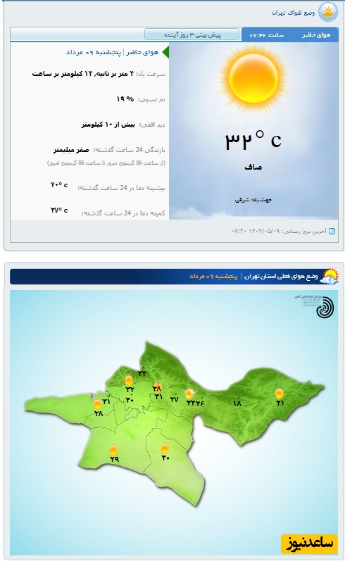 وضعیت آب و هوای امروز پنج‌شنبه 9 مرداد تهران، تبریز، اصفهان، مشهد، اهواز، قزوین، شیراز، بوشهر، رشت، ارومیه، کرمانشاه و یزد