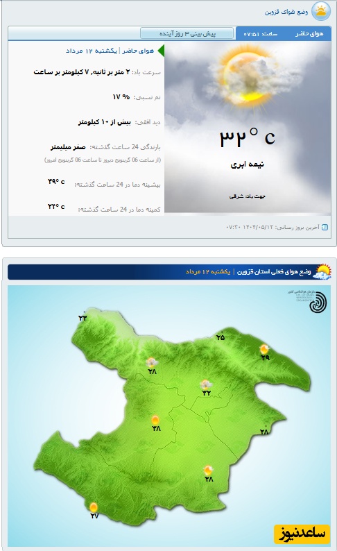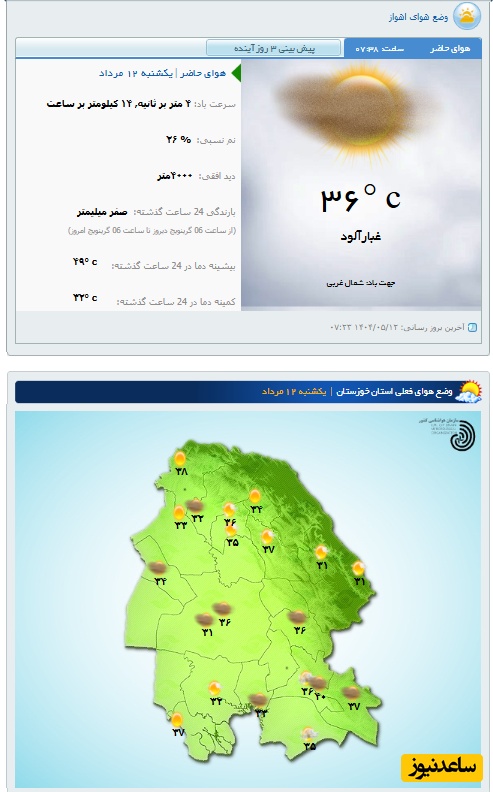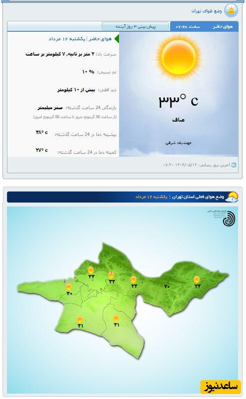 وضعیت آب و هوای امروز یکشنبه 12 مرداد تهران، تبریز، اصفهان، مشهد، اهواز، قزوین، شیراز، بوشهر، رشت، ارومیه، کرمانشاه و یزد