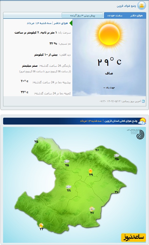 وضعیت آب و هوای امروز سه‌شنبه 14 مرداد تهران، تبریز، اصفهان، مشهد، اهواز، قزوین، شیراز، بوشهر، رشت، ارومیه، کرمانشاه و یزد