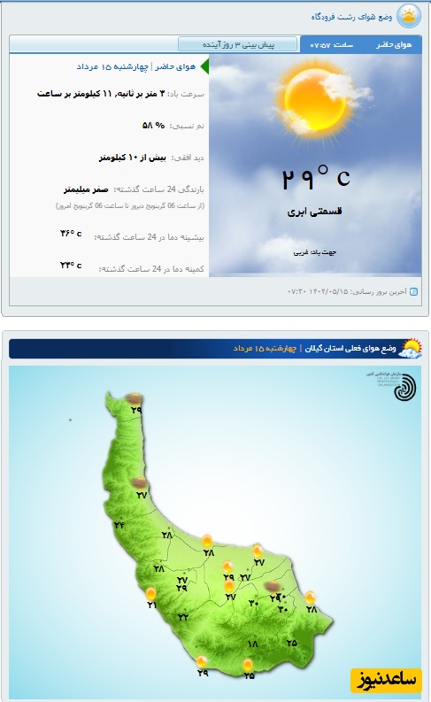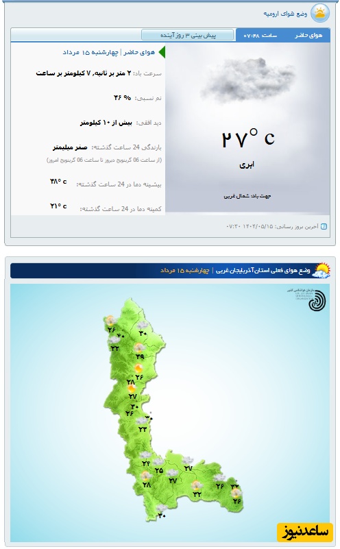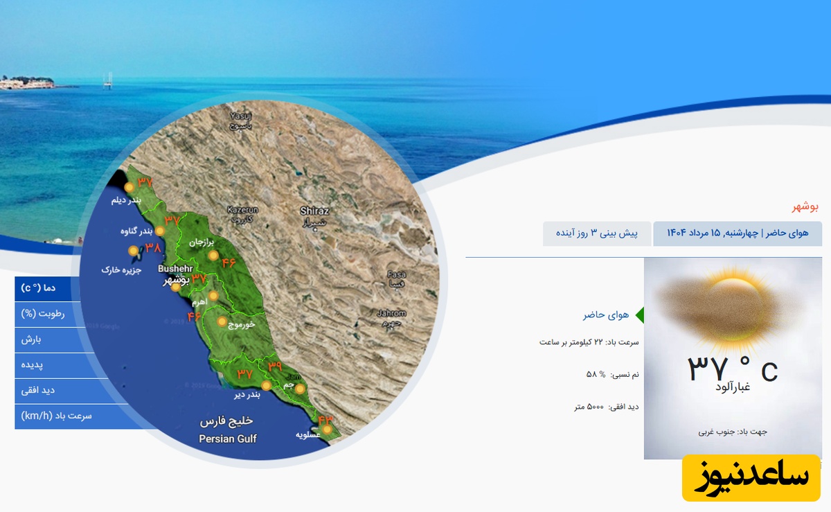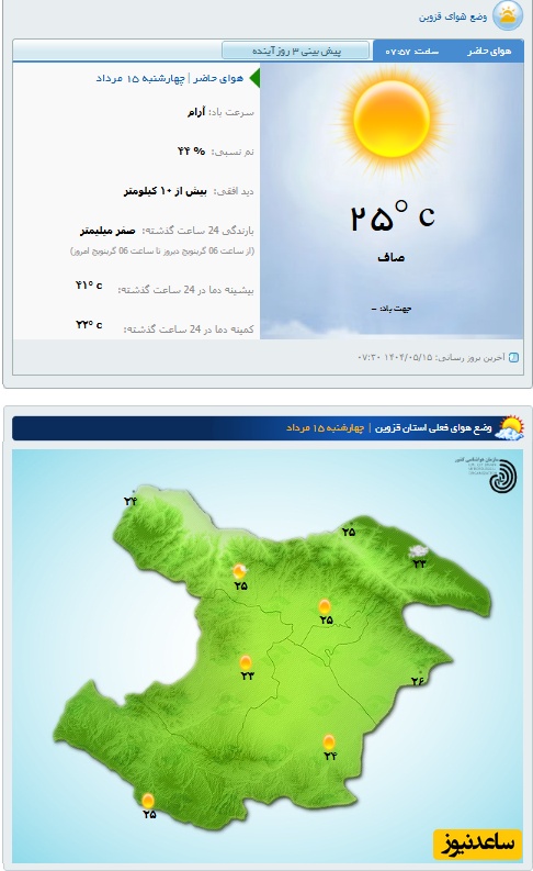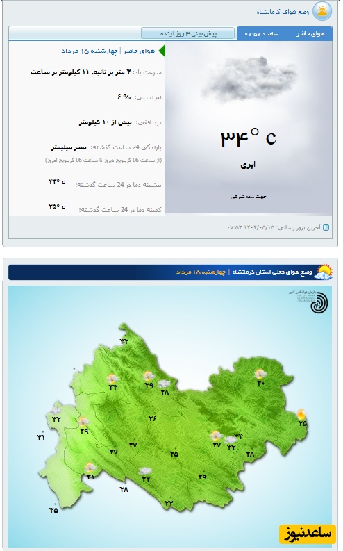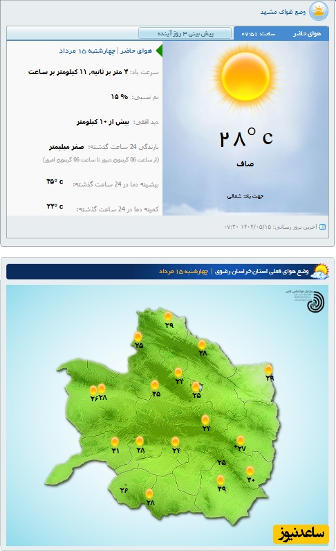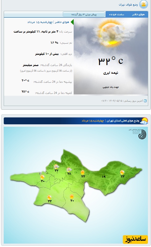 وضعیت آب و هوای امروز چهارشنبه 15 مرداد تهران، تبریز، اصفهان، مشهد، اهواز، قزوین، شیراز، بوشهر، رشت، ارومیه، کرمانشاه و یزد