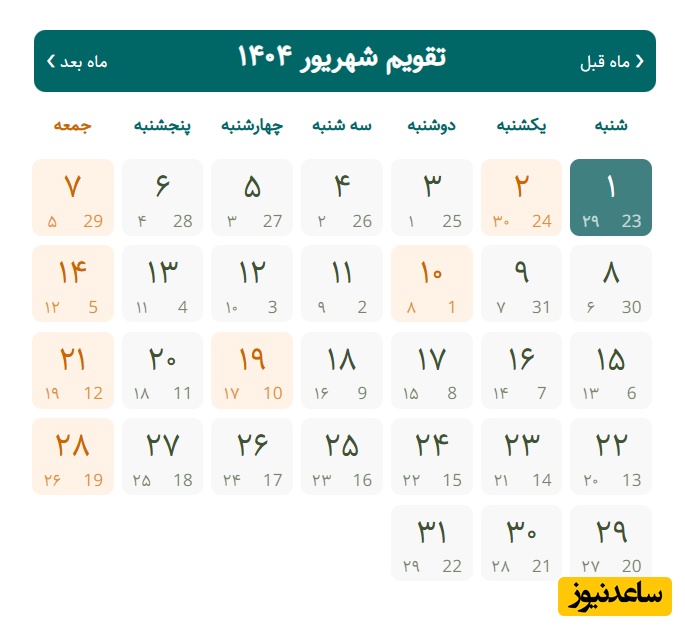 به گزارش سرویس جامعه ساعدنیوز، تعطیلات رسمی شهریور 1404 در ایران شامل روزهای اول (بزرگداشت ابوعلی سینا و روز پزشک) و دوم (شهادت امام رضا (ع) و آغاز هفته دولت) است. همچنین روزهای 8 (روز مبارزه با تروریسم و شهادت شهیدان رجایی و باهنر)، 17 (قیام 17 شهریور)، و 31 (آغاز هفته دفاع مقدس) نیز تعطیل رسمی هستند.