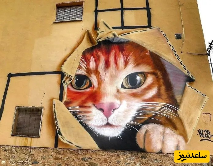 یک نقاشی دیواری به سبک خطای دید که یک گربه قرمز را در حال نگاه کردن از سوراخ یک جعبه مقوایی رنگشده نشان میدهد. این توهم گربه را در حال شکستن دیوار نشان میدهد.