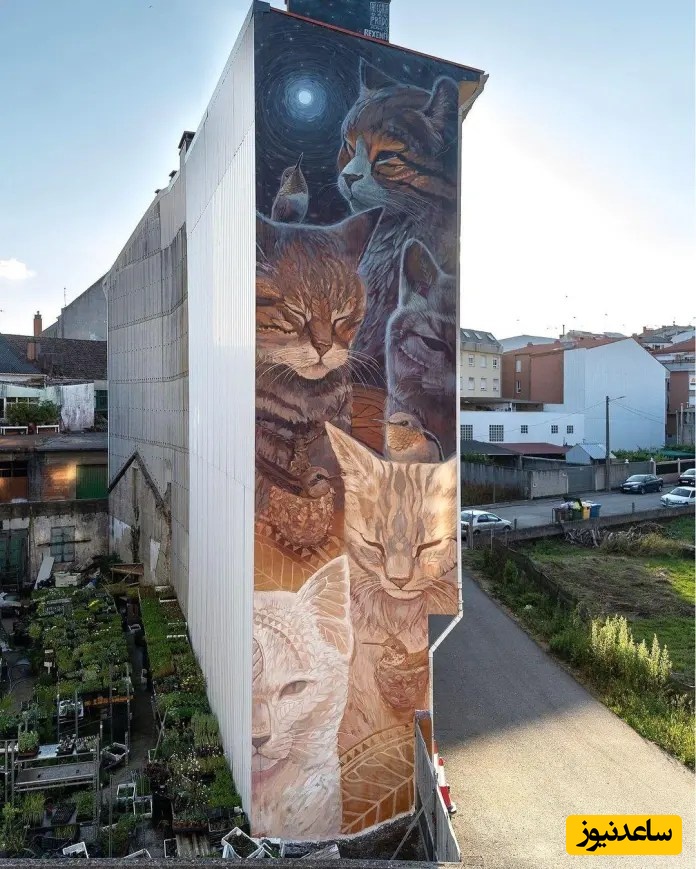 یک نقاشی دیواری بزرگ با چندین گربه با تُنهای ملایم، همراه با پرندگان. این اثر به شکل عمودی در امتداد یک دیوار بلند امتداد یافته و جزئیات طبیعتگرایانه را با فضایی رویایی ترکیب میکند.