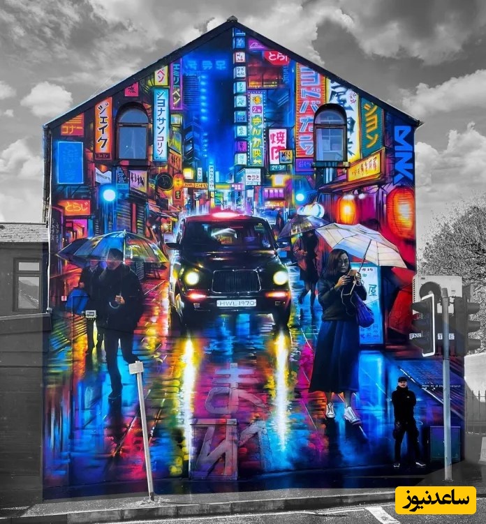 یک صحنه زنده از شهر که با رنگهای نئونی نقاشی شده، عابران پیاده با چتر، یک تاکسی و انعکاس تابلوهای ژاپنی را نشان میدهد. این نقاشی دیواری با محیط خاکستری اطرافش در تضاد است.