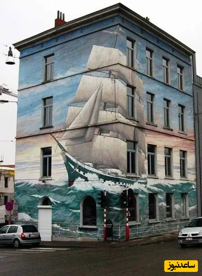 یک نقاشی دیواری خطای دید که نمای ساختمان را با تصویری از یک کشتی که در دریاهای طوفانی در حال حرکت است، پوشانده است. به نظر میرسد کشتی از گوشه سازه بیرون آمده است.
