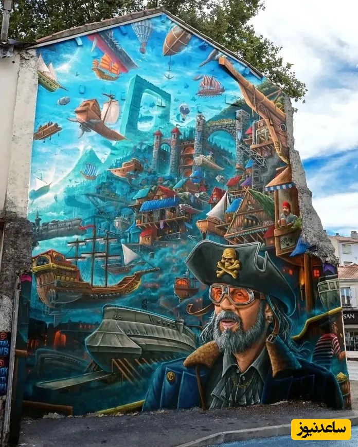 یک نقاشی دیواری فانتزی پر از کشتیهای پرنده، قلعهها و بالنهای هوایی. یک دزد دریایی با عینک آفتابی و کلاه مزین به جمجمه، در پایین صحنه، صحنه را محکم میکند و خیال را با واقعیت ادغام میکند.