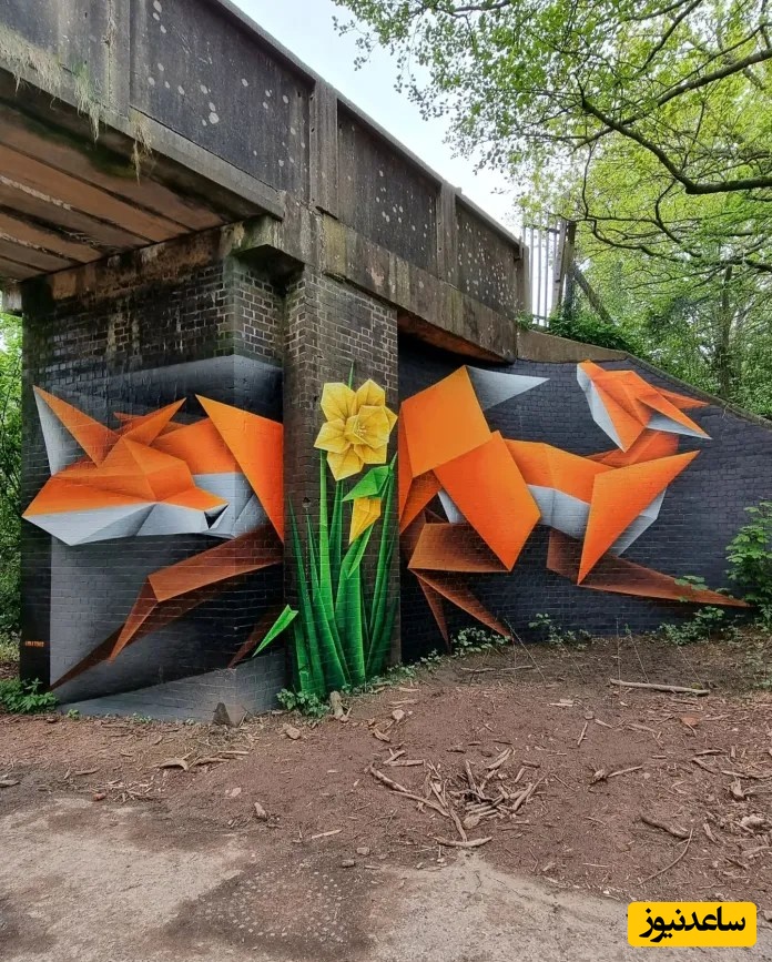 روباههای هندسی با تُنهای نارنجی، سفید و قهوهای در امتداد دیوار زیر یک پل کشیده شدهاند و کنار یک گل نرگس زرد روشن رنگآمیزی شدهاند. این طرح شبیه آدمکهای کاغذی تاشده است.