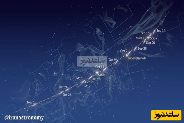 وی تاکید کرد: هر چند دنبالهدار SWAN R2 در روز جمعه، 21 شهریور امسال به کمترین فاصله با خورشید و 75 میلیون کیلومتری آن رسید، اما دنبالهدار لِمون یکشنبه 18 آبان به کمترین فاصله با مهر تابان و 79 میلیون کیلومتری خورشید میرسد. نقشه زیر مسیر دنبالهدار SWAN R2 در آسمان را نشان میدهد.
