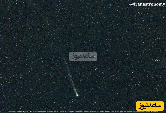 ستارهشناس آماتور Michael Mattiazzo با لنز 200 میلیمتری، بدون نیاز به تلسکوپ، دنبالهدار C/2025 R2 را شکار کرد و در گوشه تصویر، جرم کمنور دیگری قرار دارد که دنبالهدار بینستارهای 3I/ATLAS است (داخل دایره) و یکی از معدود عکسهایی است که دنبالهدار 3I بدون تلسکوپ ثبت شده است