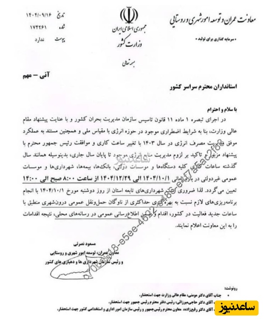 به گزارش سرویس جامعه ساعدنیوز به نقل از خبرگزاری صدا و سیمای گیلان؛ بر اساس بخشنامه سراسری معاون وزیر کشور خطاب به تمامی استانداران، بنا به شرایط اضطراری موجود در حوزه انرژی و همچنین مستند به عملکرد موفق مدیریت مصرف انرژی در سال 1403 با تغییر ساعت کاری و موافقت رئیس جمهور با این پیشنهاد و تاکید بر لزوم مدیریت منابع انرژی موجود تا پایان سال جاری، همانند سال گذشته ساعات کار تمامی دستگاهها و موسسات دولتی، بانکها، بیمه ها، شهرداری و موسسات عمومی غیردولتی از اول دی ماه 1404 تا پایان سال 1404 از ساعت 8 صبح تا 14 ظهر تعیین شد.
