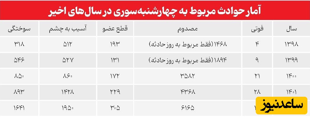 کرونا اگرچه در ایران و جهان جانهای زیادی را گرفت اما باعث شد چهارشنبهسوری سال 1398، کمخطرتر نسبت به سال قبلش باشد. در سال 1397، حدود چهارهزار و 572 نفر در بازه زمانی 15 اسفند 96 تا 15 فروردین 97 دچار آسیب ناشی از مـواد محترقـه شدند. بر پایه آمارهای منتشرشده، در این سال براثر حوادث ناشی از مواد محترقه، هشت نفر فوت کردند و 27 نفر دچار معلولیت شدند. سال 98 اما به دلیل شیوع کرونا، در پایتخت حداقل حوادث مربوط به چهارشنبهسوری تا 50 درصد کاهش پیدا کرد. در سال 98، تنها در روز حادثه، هزار و 468 نفر مصدوم شدند. از این تعداد 512 نفر دچار آسیب چشم و 193 نفر قطع عضو شدند. 318 نفر نیز دچار سوختگیهای متوسط تا شدید بودند. در این سال چهارنفر به همین دلیل فوت کردند.