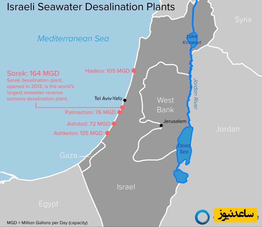 تأسیسات پنجگانه Hadera، Sorek ،Ashkelon، Ashdod، Palmachim به ترتیب 76، 72، 135، 164 و 105 میلیون گالن در روز آب شیرین میکنند.