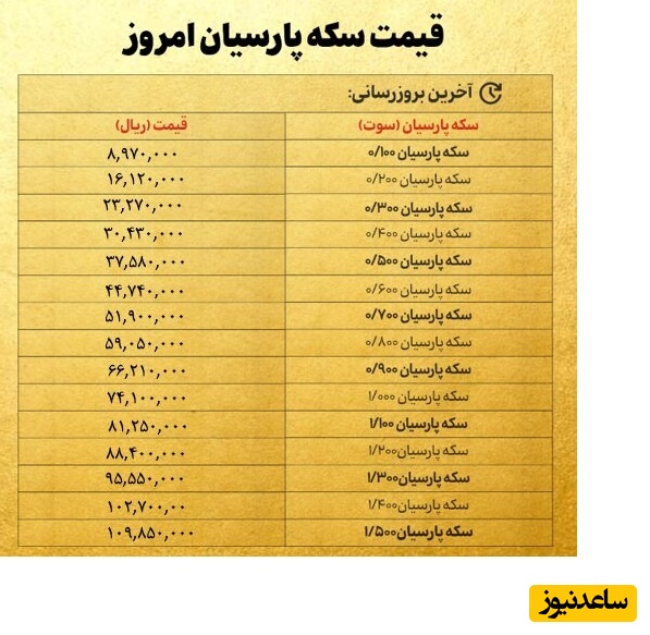 به گزارش سرویس اقتصادی ساعدنیوز،در روز شنبه 21 تیر 1404، قیمت انواع سکه پارسیان با عیار 750 در بازار ایران به شرح زیر اعلام شد: