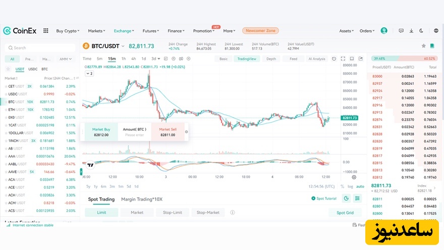 به پایین صفحه اسکرول کنید تا بخش (Spot Trading) را ببینید. در این بخش روشهای مختلفی برای ثبت سفارش مانند لیمیت و استاپ لیمیت وجود دارد.