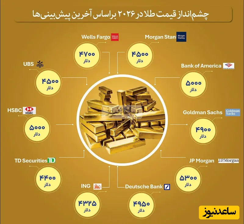 دویچهبانک میانگین قیمت 4450 دلار برای هر اونس را پیشبینی کرد. موسسه ING میانگین قیمت طلا در سال 2026 را حدود 4325 دلار در هر اونس برآورد کرد. مورگان استنلی پیشبینی خود را به محدوده 4400 تا 4500 دلار برای هر اونس ارتقا داد.