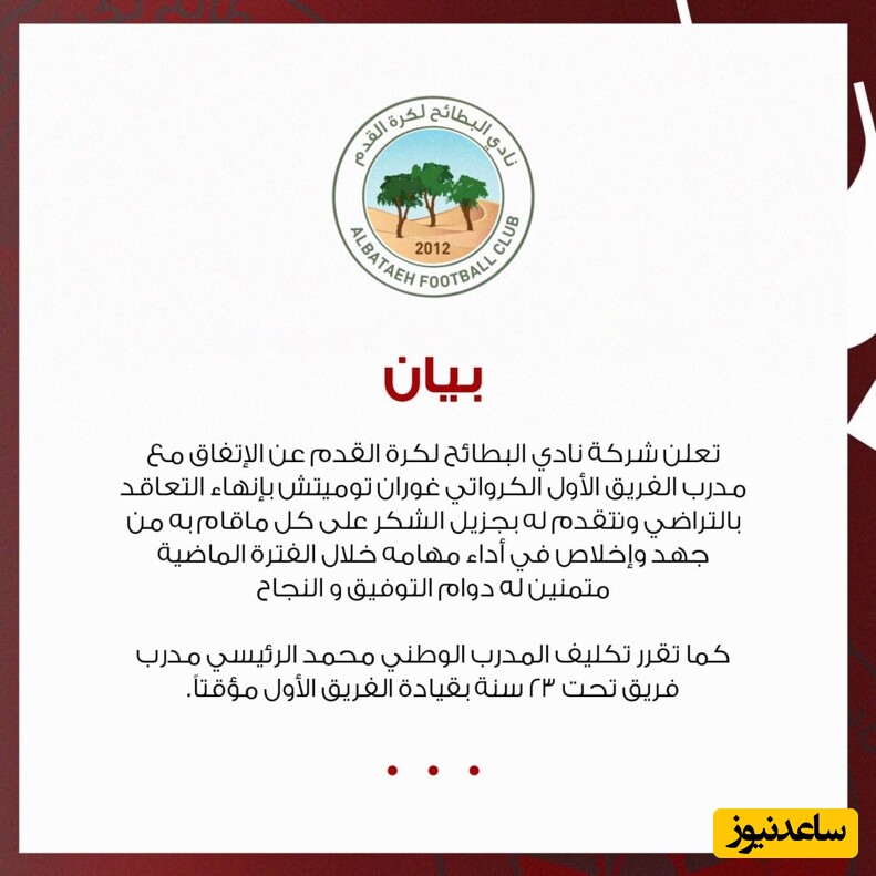 «باشگاه فوتبال البطائح اعلام میکند که با سرمربی تیم اول، گوران تومیچ کروات، بر سر فسخ قرارداد به صورت توافقی به تفاهم رسیده است. از زحمات و تعهد او در انجام وظایفش در طول این مدت سپاسگزاری کرده و برای او آرزوی موفقیت و پیشرفت دائمی داریم.