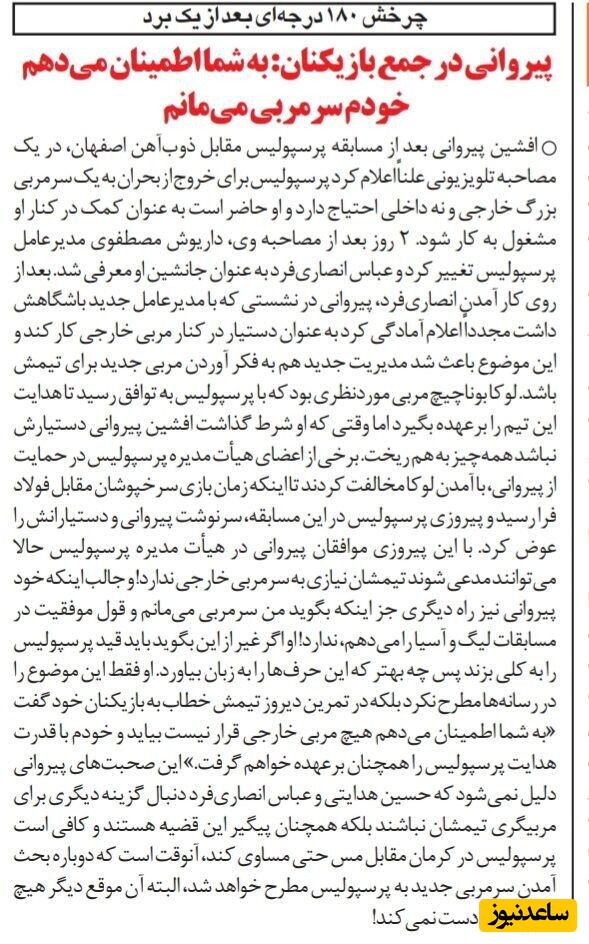 به گزارش سرویس ورزش ساعدنیوز به نقل از خبرورزشی، پس از اینکه افشین قطبی در میانه لیگ هشتم تصمیم به کناره گیری گرفت، پرسپولیس با بحران سرمربیگری مواجه شد و این مساله به شدت هوادارانش را نگران کرد. در آن مقطع افشین پیروانی دستیار اول قطبی بود و پس از استعفای او، تحت عنوان سکاندار موقت هدایت سرخپوشان پایتخت را بر عهده گرفت. بعد از ارتقاء مقام پیروانی از دستیار اولی به سرمربی موقت، داریوش مصطفوی مدیرعامل وقت باشگاه پرسپولیس عوض شد و جای خود را به عباس انصاری فرد داد تا روند انتخاب سرمربی جدید به تعویق بیفتد و البته افشین پیروانی نیز اعلام کرده بود حاضر است تحت عنوان دستیار زیر نظر سرمربی خارجی کار کند. مدیران پرسپولیس ابتدا میخواستند لوکا بوناچیچ را به تهران بیاورند اما این مربی کروات شرط کرد دستیارانش را خودش انتخاب میکند و تمایلی به همکاری با افشین پیروانی نشان نداد. در چنین شرایطی پرسپولیسیها به مصاف فولاد خوزستان رفتند و این تیم را شکست دادند تا سرپرست کنونی قرمزپوشان پایتخت که 16 سال پیش کار فنی میکرد، حرفهای دیگری بزند. خبرورزشی 29 دی سال 87 حرفهای افشین پیروانی در جمع بازیکنان پرسپولیس را منتشر کرد و این گزارش سر و صدای زیادی راه انداخت. پیروانی به شاگردان خود گفته بود: "به شما اطمینان میدهم هیچ مربی خارجی قرار نیست بیاید و خودم با قدرت هدایت پرسپولیس را همچنان بر عهده خواهم گرفت"