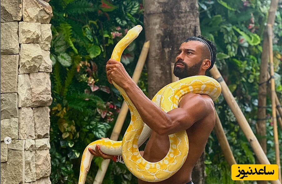 عکسی از رامین رضاییان با مار پیتون را مشاهده میکنید.
