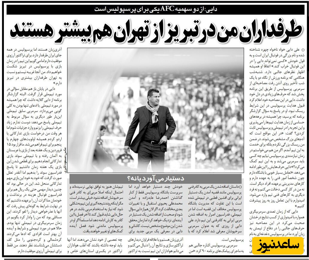 به گزارش سرویس ورزش ساعدنیوز به نقل از خبرورزشی، علی دایی 15 سال قبل در چنین روزهایی هدایت پرسپولیس را بر عهده داشت ولی هنوز از بابت رفتاری که با او در تیم ملی در فروردین همان سال صورت گرفت، به شدت دلخور بود. دایی طی مصاحبهای که پنجم بهمن سال 88 در خبرورزشی نیز منتشر شد، پیرامون پرسپولیس تیم ملی و... حرفهای خاصی بر زبان آورد: