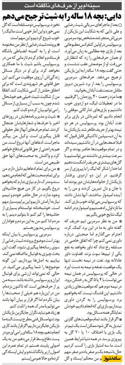 - پرونده بازگشت شیث رضایی به پرسپولیس از نظرم مختومه است. او را به کمیته انضباطی باشگاه فرستادم و اعلام کردم تا وقتی من در پرسپولیس هستم، رضایی با ما همکاری نخواهد کرد. البته این حق قانونی هر شهروندی است که بابت احقاق حقوق خود از دیگران شکایت کند و اتفاقا من از شکایت شیث رضایی خیلی هم خوشحال شدم چون میتوانم بسیاری از مسائل را بیان کرده و ثابت کنم ( در آن مقطع صحبت بر اثر این بود که شیث رضایی از علی دایی شکایت کرده است )