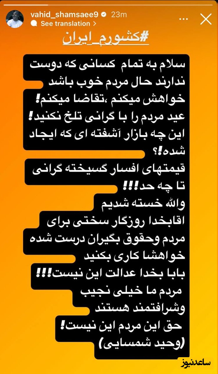 استوری اعتراض وحید شمسایی به افزایش قیمت دلار را مشاهده میکنید.