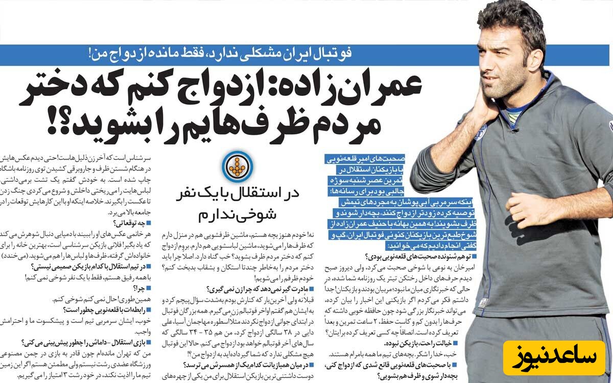 عمرانزاده در ادامه تصریح کرد: من مجردم ولی نمیدانم چرا شما به ازدواجکردنم گیر دادهاید! یعنی این فوتبال هیچ مشکلی ندارد غیر از ازدواج من؟