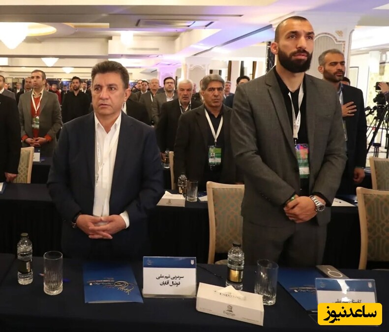 عکسی از حضور روزبه چشمی بهعنوان کاپیتانهای تیم ملی در مجمع انتخاباتی فدراسیون فوتبال در کنار امیر قلعهنویی را مشاهده میکنید.