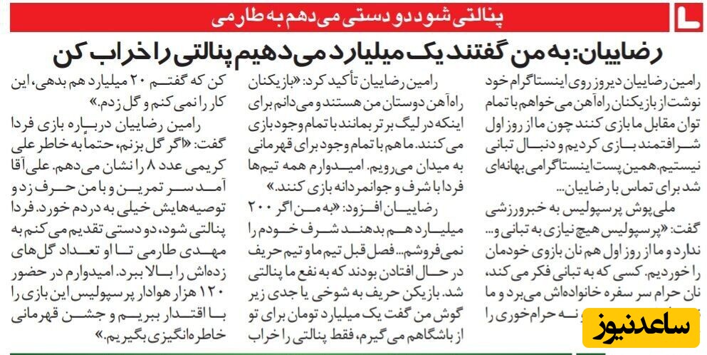 رامین ادامه داد: حتی اگر 200 میلیارد تومان هم بدهند، شرف خودم را نمیفروشم. فصل قبل وقتی تیم ما ( راه اهن) در حال سقوط بود، با یک تیم پایین جدولی دیگر بازی داشتیم و وقتی داور به نفع ما پنالتی اعلام کرد، بازیکن حریف به شوخی یا جدی زیر گوشم گفت: یک میلیارد تومان برایت از باشگاهم میگیرم فقط پنالتی را خراب کن! اما گفتم حتی اگر 20 میلیارد تومان هم بدهی این کار را نمیکنم. اتفاقاً آن پنالتی را گل کردم.