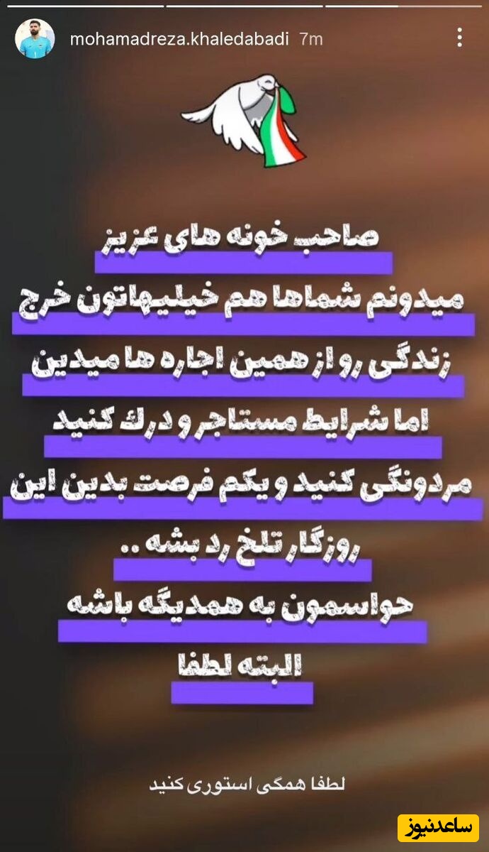 به دنبال این اتفاقات محمدرضا خالدآبادی، دروازهبان فصل گذشته استقلال دقایقی قبل با انتشار یک استوری اینستاگرامی از صاحبخانهها خواست تا با توجه به شرایط فعلی با اجارهنشینها مراعات کنند.