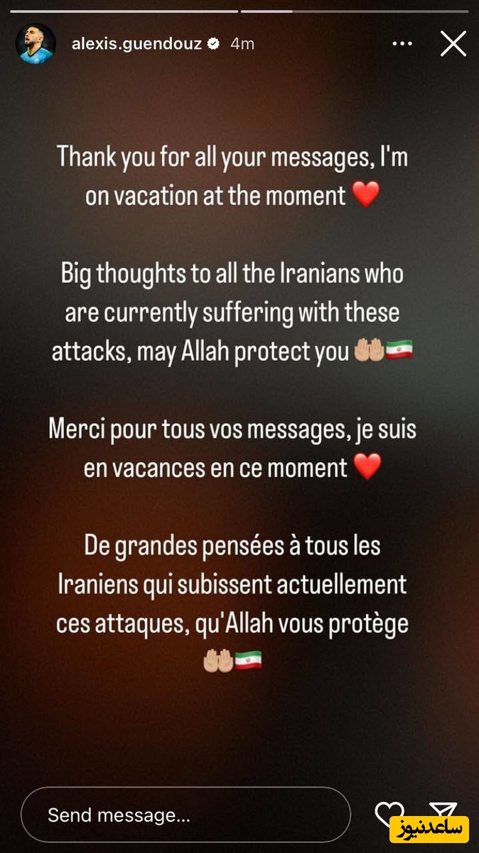 به گزارش سرویس ورزش ساعدنیوز، آلکسیس گندوز، دروازهبان الجزایری و مسلمان فصل گذشته پرسپولیس با انتشار یک استوری در جریان حملات رژیم جنایتکار صهیونیستی برای ملت ایران آرزوی توفیق و سلامتی کرد و وضعیت خود را اطلاع داد.