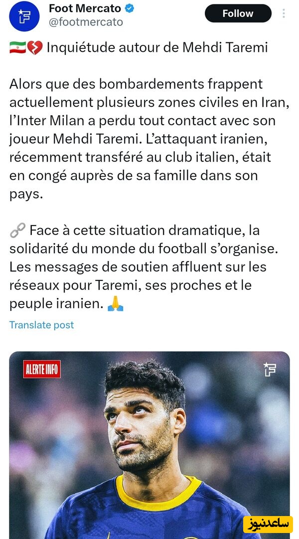 به گزارش سرویس ورزش ساعدنیوز، حمله اسرائیل به کشورمان باعث شده تا دیروز سهشنبه سایت معتبر و مشهور فوتو میرکاتو با مهدی طارمی، مهاجم اینتر و مردم ایران اعلام همبستگی کند.