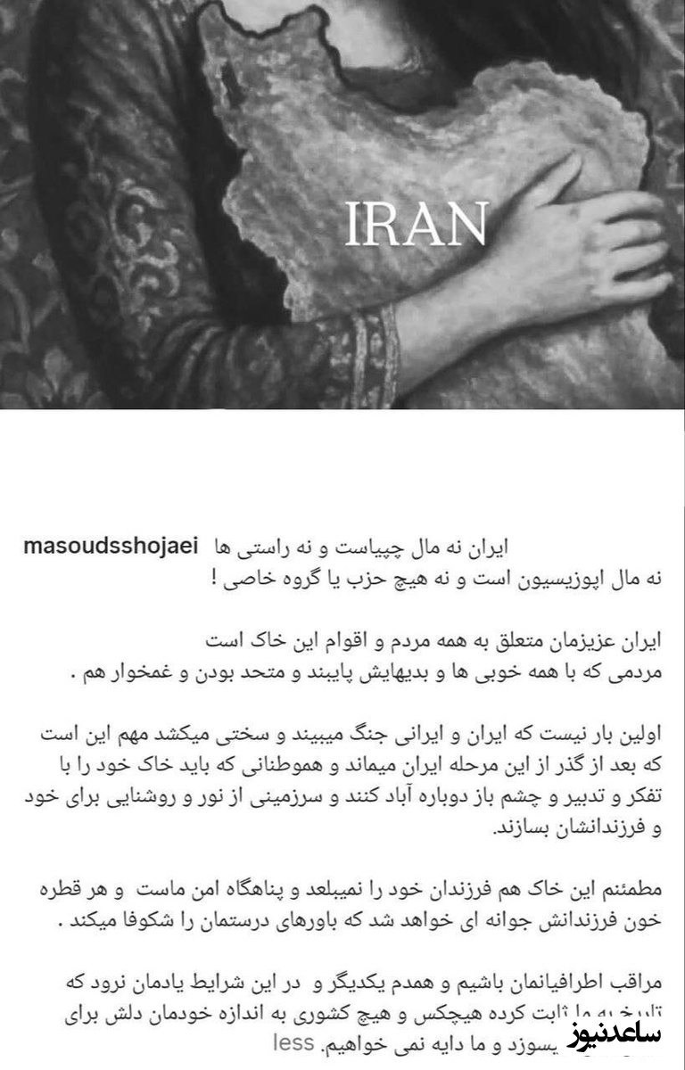 به گزارش سرویس ورزش ساعدنیوز، مسعود شجاعی، کاپیتان سابق تیم ملی فوتبال کشورمان، در واکنش به شرایط حساس و ملتهب کشور، با انتشار پستی احساسی در اینستاگرام، پیامی از همبستگی، تعقل و وطندوستی خطاب به همه ایرانیان منتشر کرد.