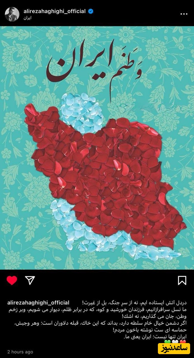 علیرضا حقیقی، دروازهبان اسبق تیم ملی فوتبال ایران نیز با انتشار تصویری از نقشه ایران نوشت: «در دل آتش ایستادهایم نه از سر جنگ بلکه از غیرت. ما نسل سرافرازانیم، فرزندان خورشید و کوه که در برابر ظلم دیوار میشویم وبر زخم وطن جان میگذاریم نه اشک. اگر دشمن خیال خام سلطه دارد بداند که این خاک قبله دلاوران است و هر وجبش حماسهای است نوشته با خون مردم. ایران تنها نیست، ایران یعنی ما.»