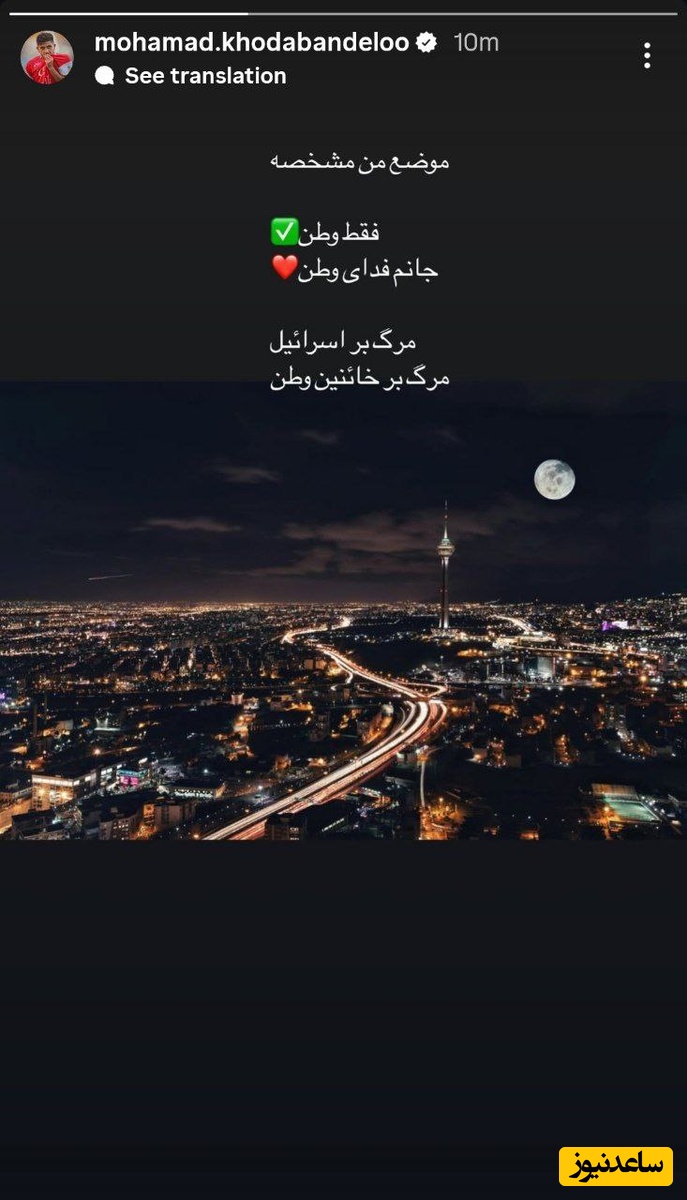 به گزارش سرویس ورزش ساعدنیوز، محمد خدابندهلو، هافبک جوان تیم پرسپولیس، با انتشار یک استوری احساسی در فضای مجازی موضع خود را نسبت به تحولات اخیر و حملات رژیم صهیونیستی بیان کرد.