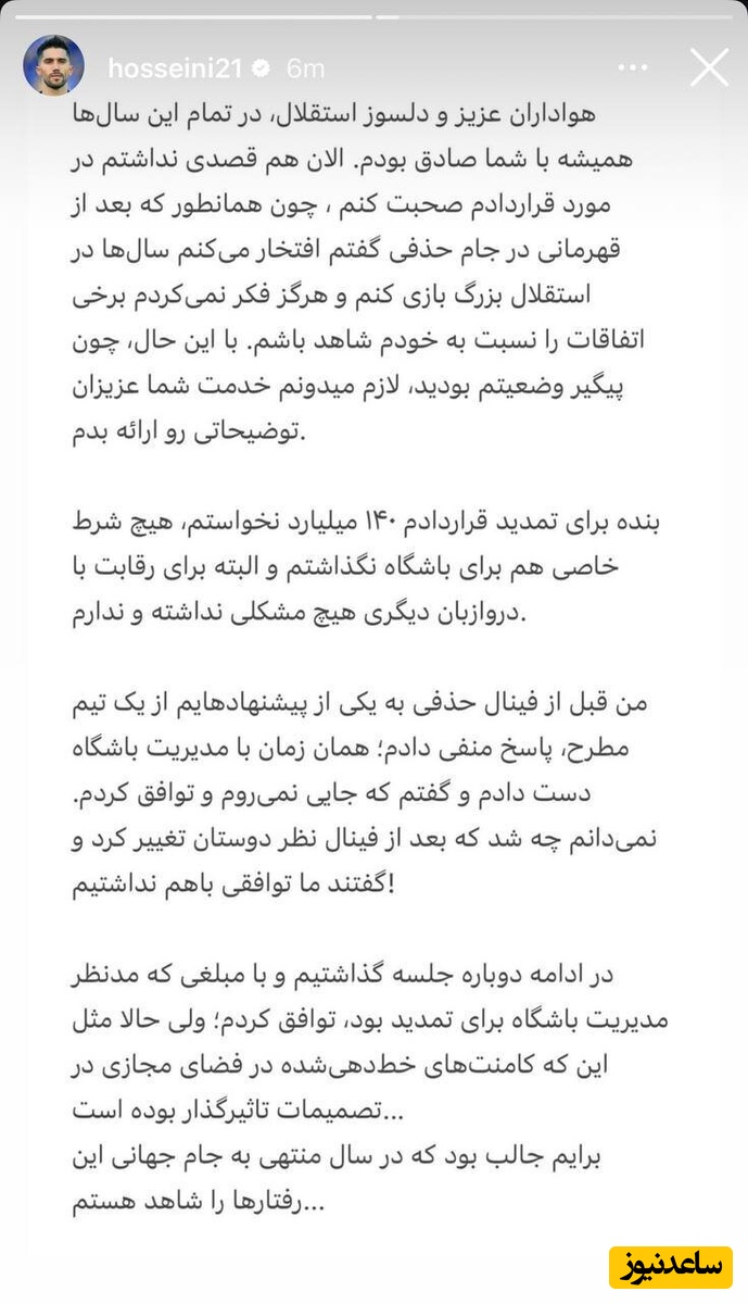 به گزارش سرویس ورزش ساعدنیوز، این روزها بحث تمدید قرارداد سیدحسین حسینی با استقلال داغ است و در این میان اخبار مختلفی راجع به درخواست وی از مدیران باشگاه به گوش می رسد که این دروازه بان آبی بالاخره نسبت به این اخبار عجیب واکننش نشان داد.